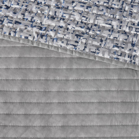 Give your bedroom a new luxurious look with the Madison Park Rhapsody 6 Piece Reversible Jacquard Coverlet Set. This reversible coverlet features a navy and grey stripe design of several different motifs on the face with a solid grey reverse, for a chic transitional look. The 2 matching shams complement the design of the coverlet to complete this glam comforter set. Also included are 3 decorative pillows with embroidery and pleated details that provide the finishing touches. Machine washable for easy care, this jacquard coverlet set brings a sophisticated update to your bedroom that's perfect for summer use or as an extra layer of warmth in the winter.