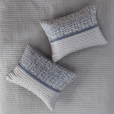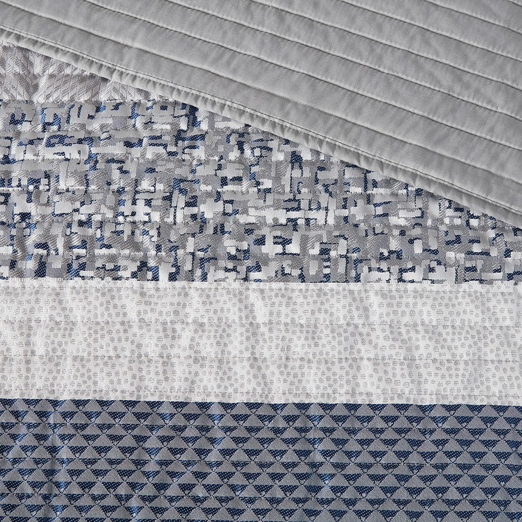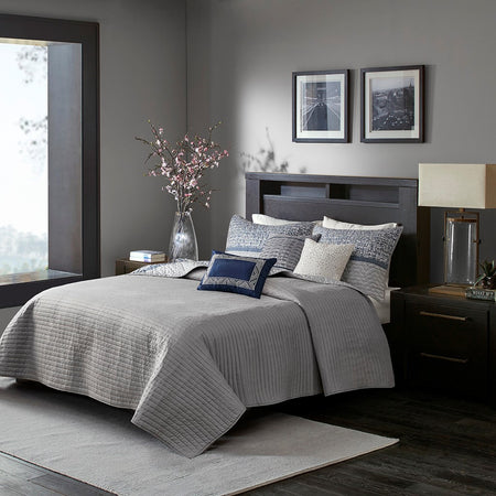 Give your bedroom a new luxurious look with the Madison Park Rhapsody 6 Piece Reversible Jacquard Coverlet Set. This reversible coverlet features a navy and grey stripe design of several different motifs on the face with a solid grey reverse, for a chic transitional look. The 2 matching shams complement the design of the coverlet to complete this glam comforter set. Also included are 3 decorative pillows with embroidery and pleated details that provide the finishing touches. Machine washable for easy care, this jacquard coverlet set brings a sophisticated update to your bedroom that's perfect for summer use or as an extra layer of warmth in the winter.