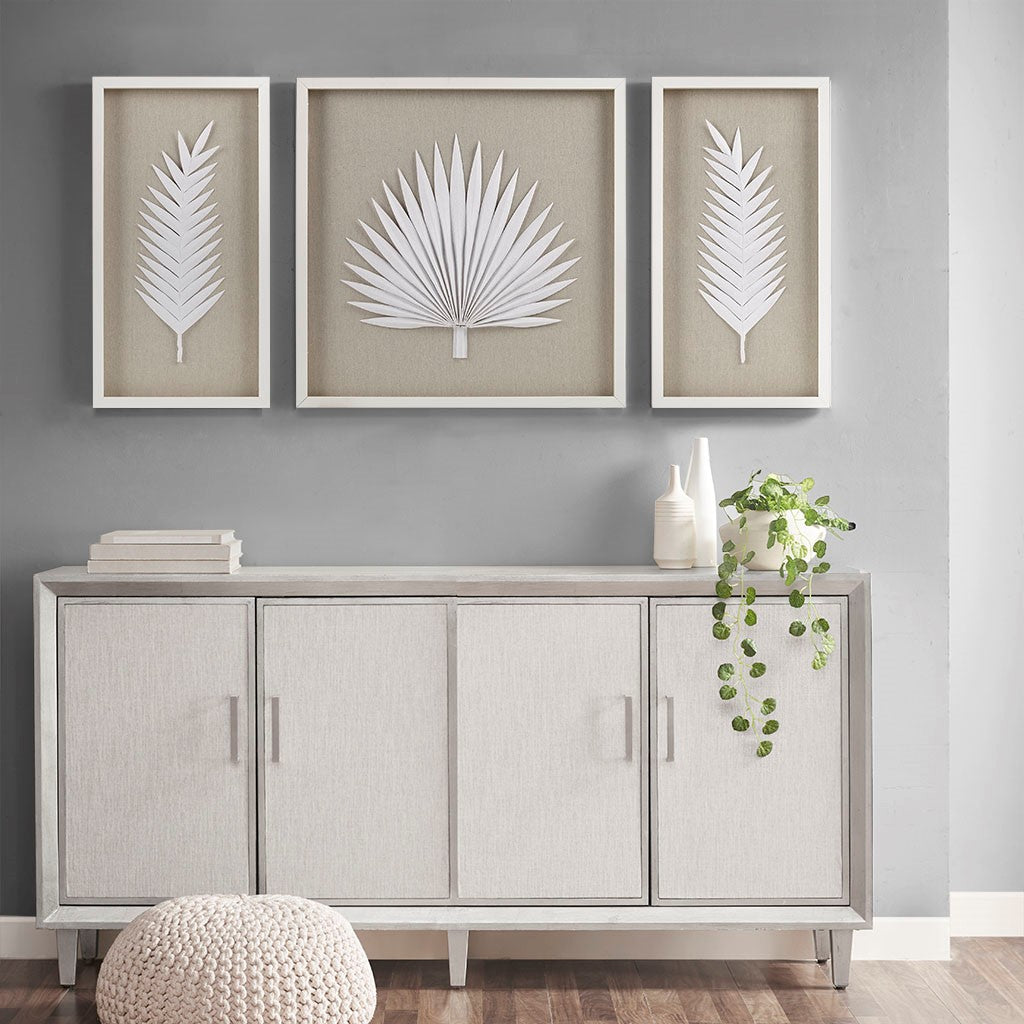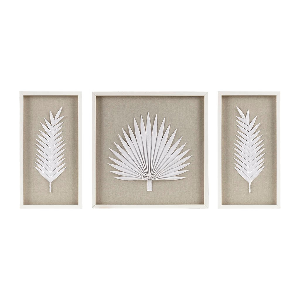 Refresh your space with the coastal elegance of the Madison Park Sabal Palm Rice Paper Framed Shadow Box 3 Piece Set. Each shadow box features a handmade, rice paper palm on a soft linen ground for a naturally modern and unique botanical design. Placed under glass and finished with a white frame for an elevated, gallery look and feel. 2 D-rings on the reverse of each piece makes this 3 Piece set easy to hang in any living room, entryway, or bedroom; Hang this set together for a large focus wall decor or hang pieces separately to fit any space and tie a room together. Spot clean only.