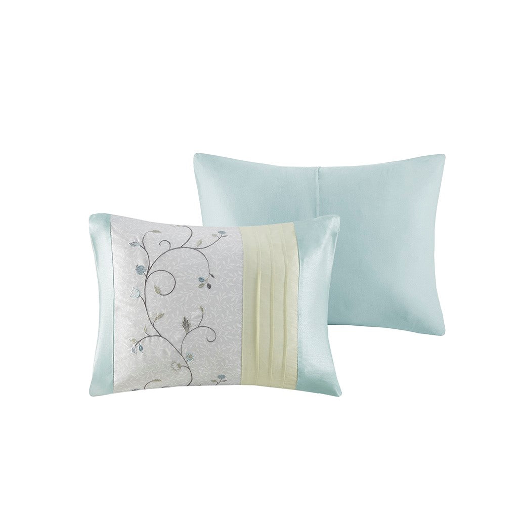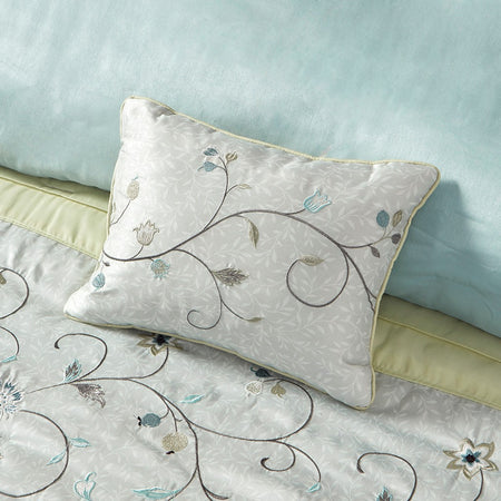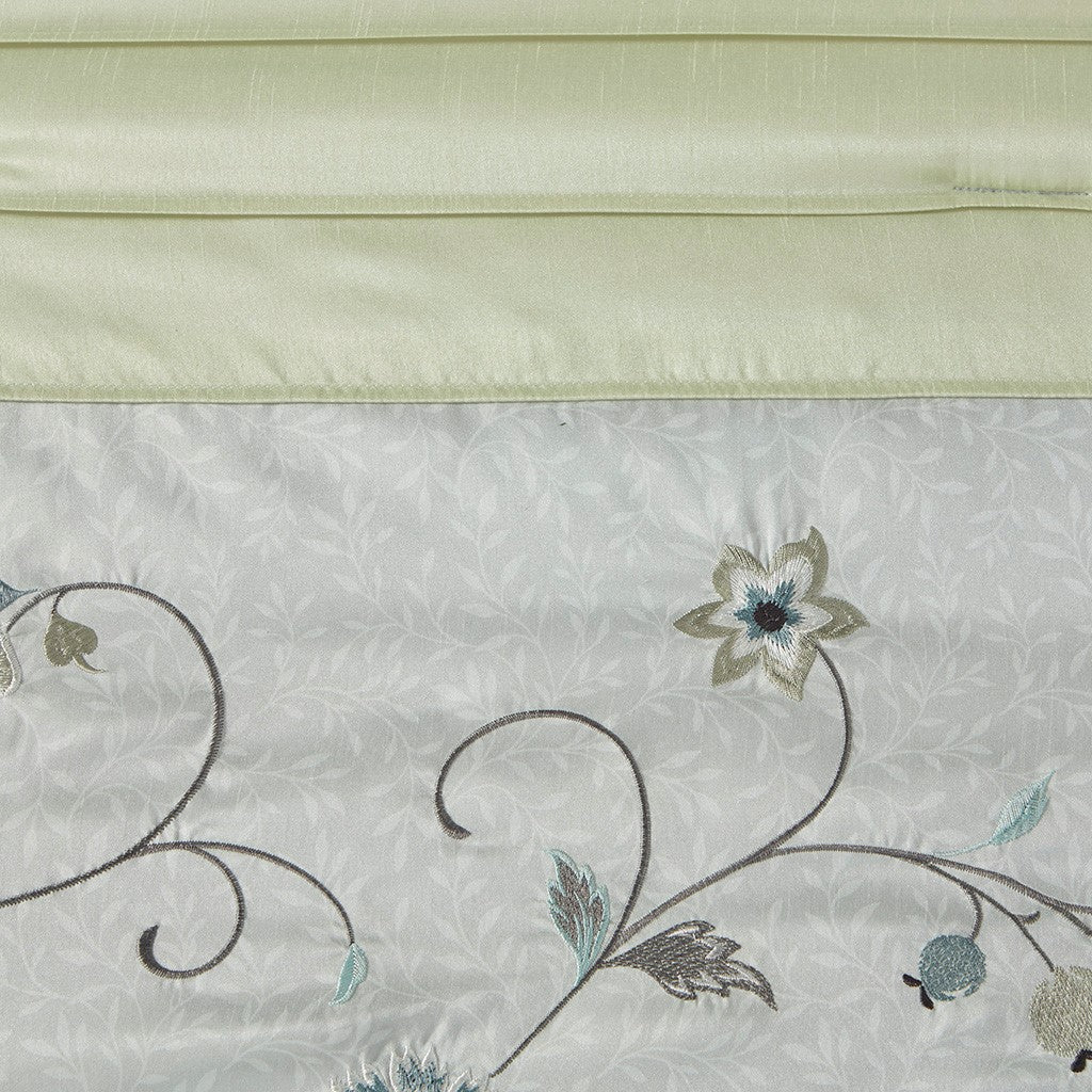 Elegantly update your bedroom with the Madison Park Serene 7 Piece Comforter Set. A beautifully embroidered floral pattern is showcased on the faux silk comforter. The pieced design, in aqua, green, and grey hues, adds a lovely contrast and texture to the ensemble. A solid aqua bed skirt gracefully complements the enticing design seen on the top of the comforter. Matching shams bring the unique style of the comforter to the head of the bed, giving it a truly luxurious look. Three decorative pillows with intricate embroidery, pleating, and piecing, complete this exquisite comforter set. Items in the set may come in a rolled or compressed packaging, which will need to be fluffed up or steam ironed before use to remove wrinkles.