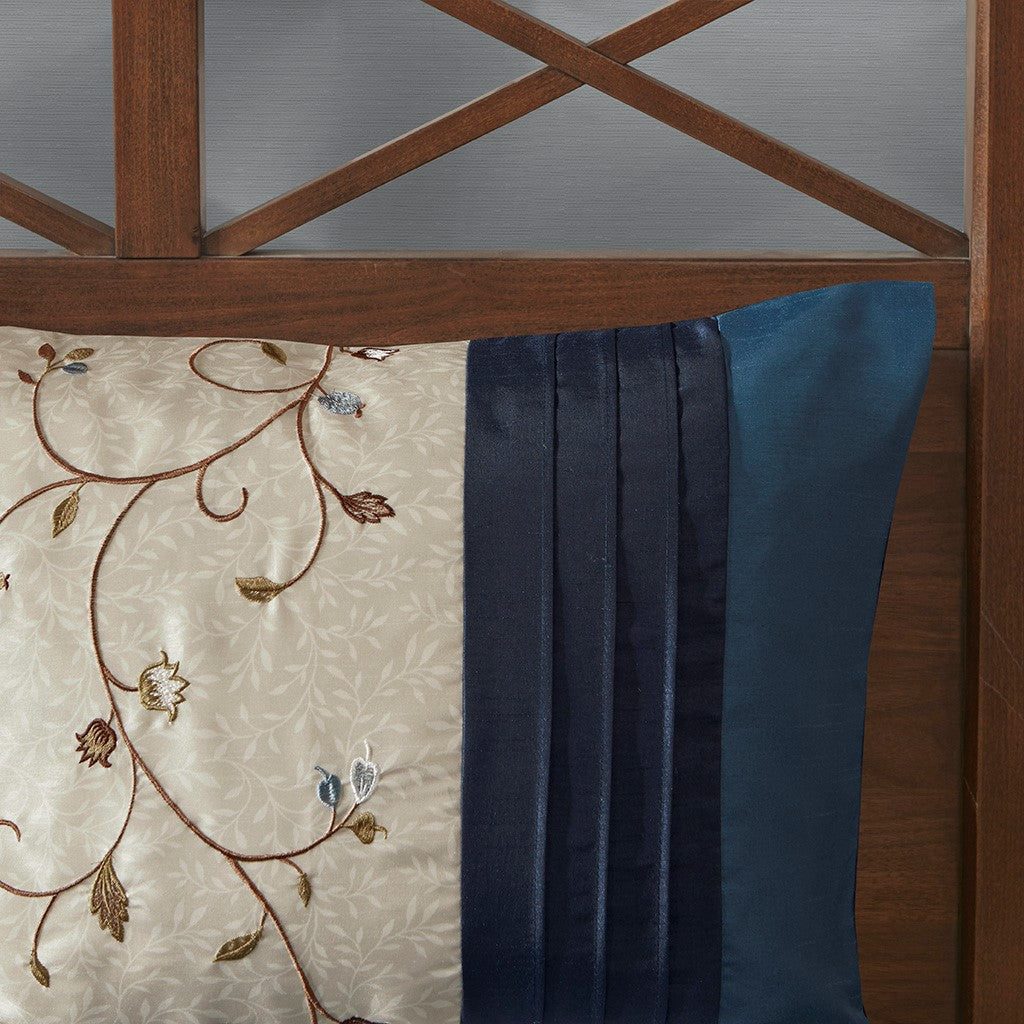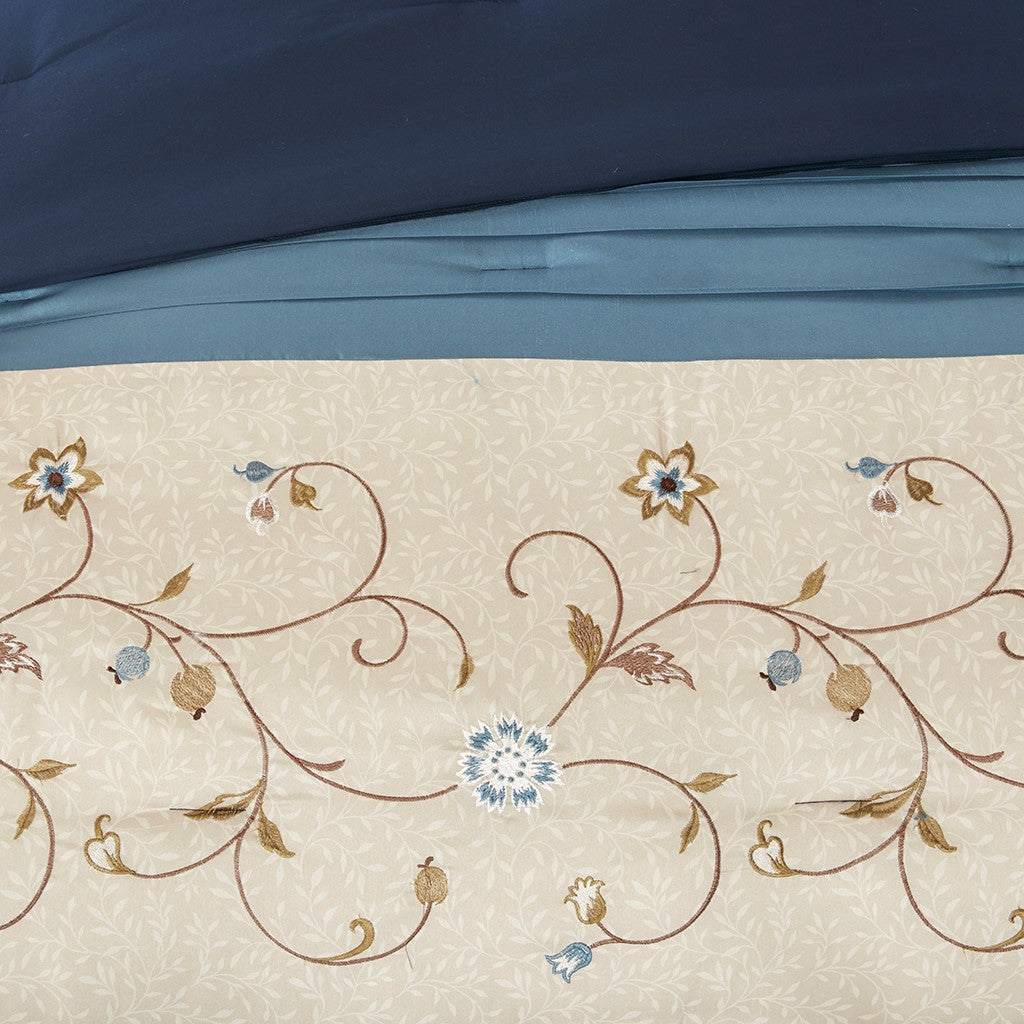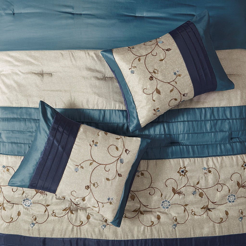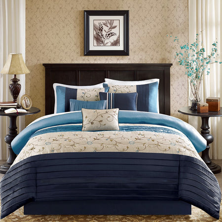 Serene Embroidered 7 Piece Comforter Set - Navy - Queen Size