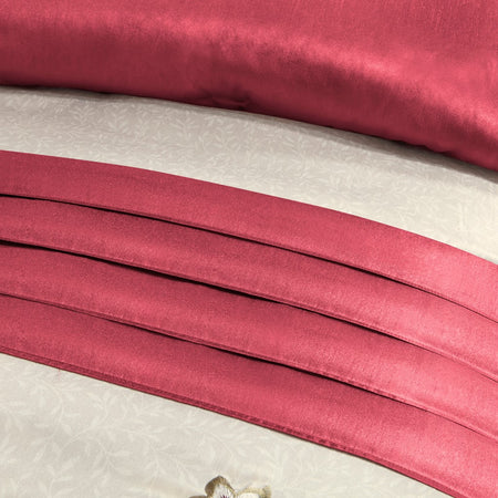 The Serene bedding collection provides an elegant look to your home. The top of the comforter is a mix of rich red, chocolate brown, and ivory with piecing details while the ivory section has an embroidered floral pattern for a soft divide from these bold colors. Made from polyester dupioni, this fabric will produce a shine and pick up the light on both the comforter and shams. The decorative pillows come in a combination of solids, stripes, and embroidery to pull this whole set together. Items in the set may come in a rolled or compressed packaging, which will need to be fluffed up or steam ironed before use to remove wrinkles.