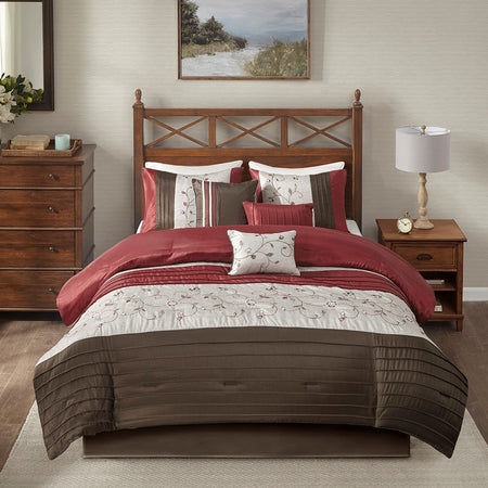 Serene Embroidered 7 Piece Comforter Set - Red - Cal King Size