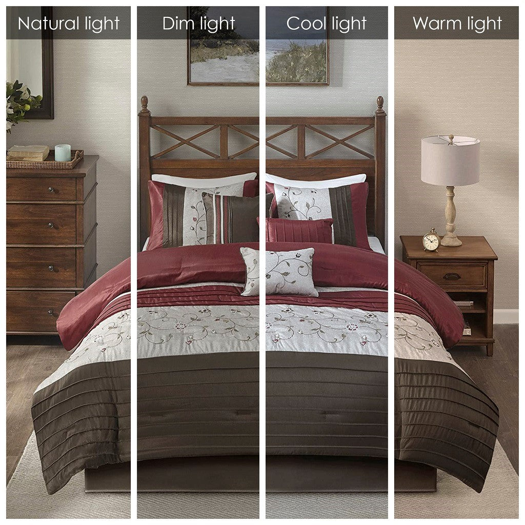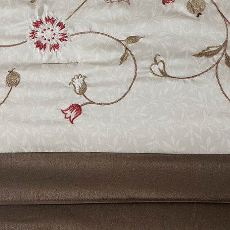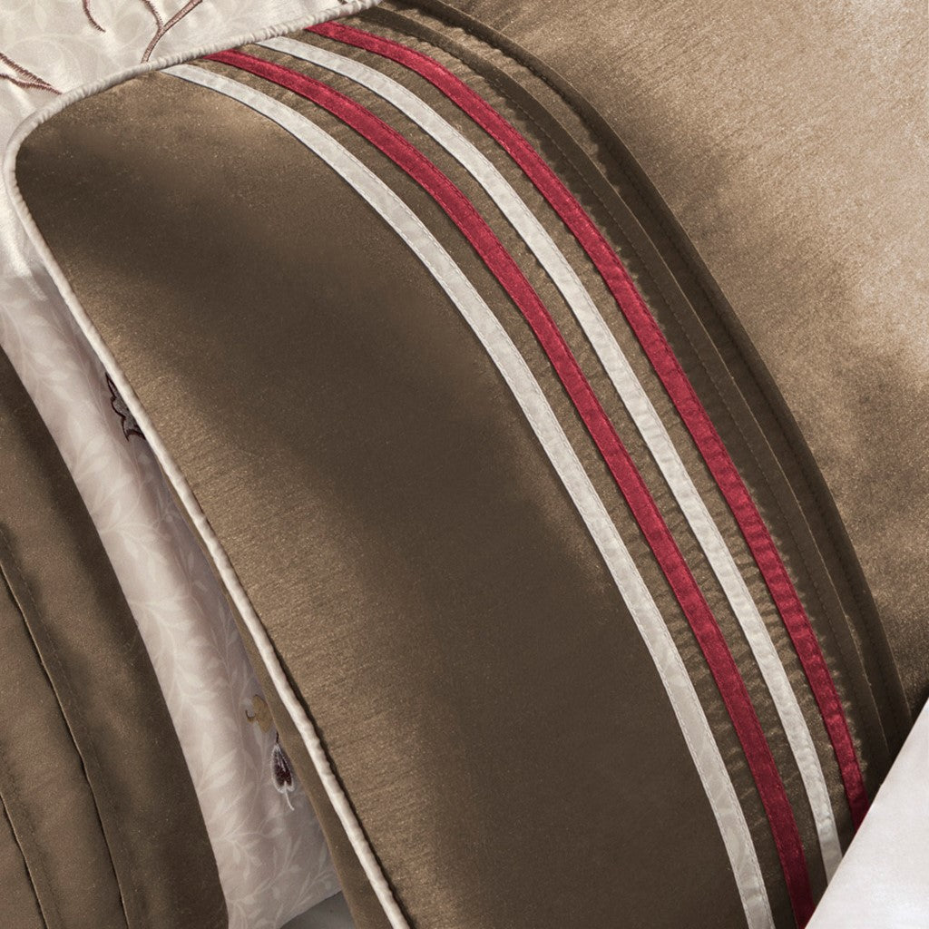 The Serene bedding collection provides an elegant look to your home. The top of the comforter is a mix of rich red, chocolate brown, and ivory with piecing details while the ivory section has an embroidered floral pattern for a soft divide from these bold colors. Made from polyester dupioni, this fabric will produce a shine and pick up the light on both the comforter and shams. The decorative pillows come in a combination of solids, stripes, and embroidery to pull this whole set together. Items in the set may come in a rolled or compressed packaging, which will need to be fluffed up or steam ironed before use to remove wrinkles.