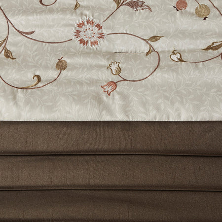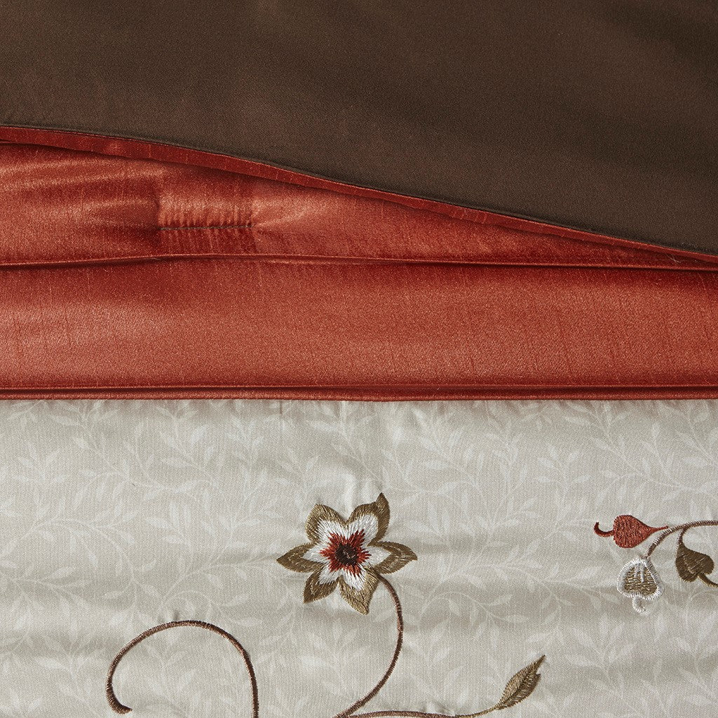 The Serene bedding collection provides an elegant look to your home. The top of the comforter is a mix of rich rust, chocolate brown, and ivory with piecing details while the ivory section has an embroidered floral pattern for a soft divide from these bold colors. Made from polyester dupioni, this fabric will produce a shine and pick up the light on both the comforter and shams. The decorative pillows come in a combination of solids, stripes, and embroidery to pull this whole set together. Items in the set may come in a rolled or compressed packaging, which will need to be fluffed up or steam ironed before use to remove wrinkles.