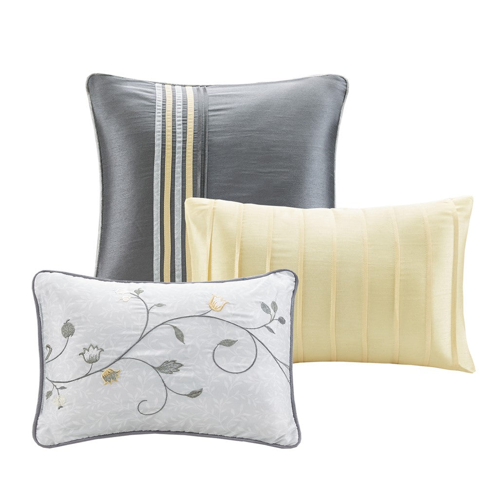 Elegantly update your bedroom with the Madison Park Serene 7 Piece Comforter Set. A beautifully embroidered floral pattern is showcased on the faux silk comforter. The pieced design, in yellow and grey hues, adds a lovely contrast and texture to the ensemble. The solid dark grey reverse complements the enticing design seen on the top of the comforter and continues gracefully down to the bed skirt. Matching shams bring the unique style of the comforter to the head of the bed, giving it a truly luxurious look. Three decorative pillows with intricate embroidery, pleating, and piecing, complete this exquisite comforter set. Items in the set may come in a rolled or compressed packaging, which will need to be fluffed up or steam ironed before use to remove wrinkles.