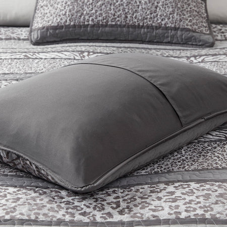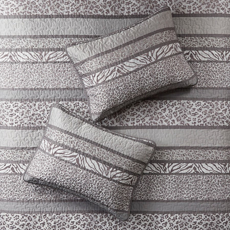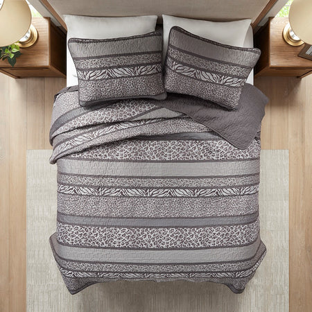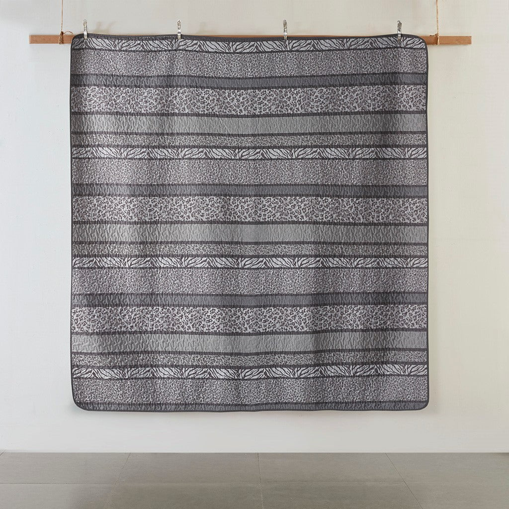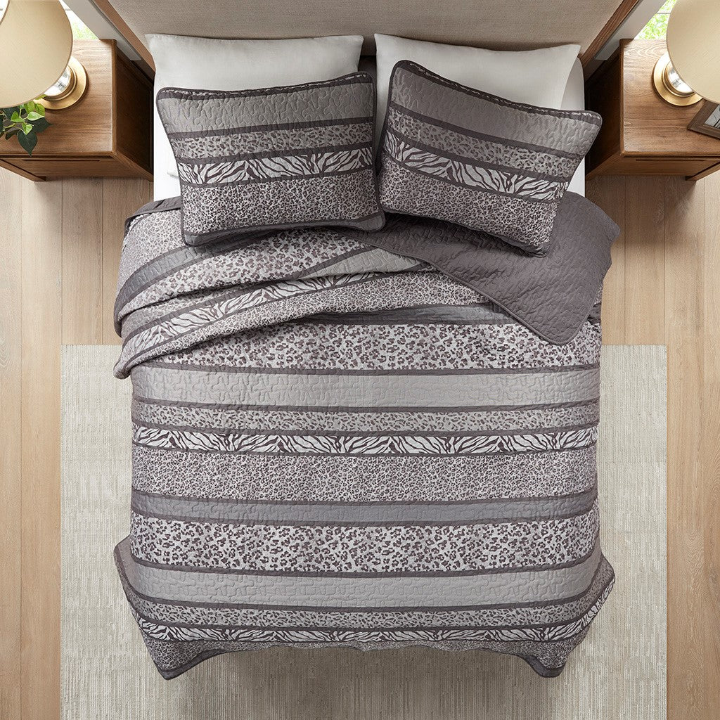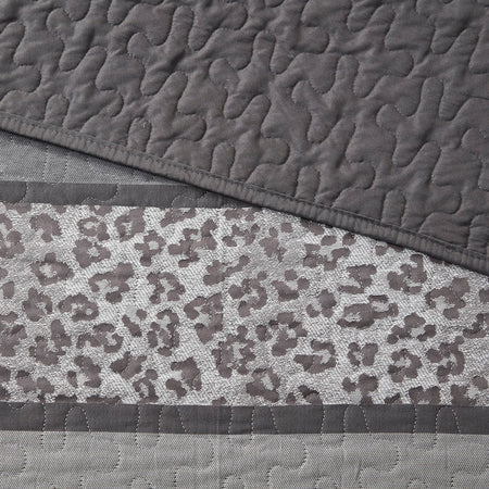 Luxury meets traditional style with the Madison Park Seri 3 Piece Reversible Jacquard Coverlet Set. This reversible quilted coverlet features a striped motif of solid gray and animal prints with a solid gray reverse to create a chic and glamorous look. Machine washable for easy care, this luxurious jacquard coverlet set is perfect for use in the summer or as an added layer of warmth in the winter. The reversible coverlet also has an antimicrobial treatment that provides built-in freshness protection, inhibits growth of odor causing bacteria, and keeps the fabric newer, longer.