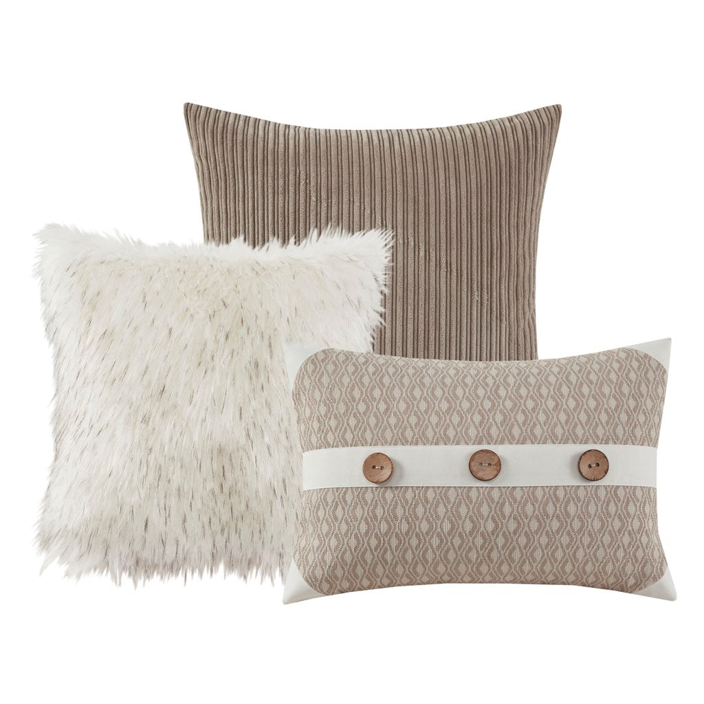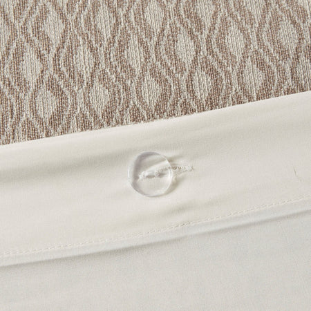 Elevate your bedroom with luxurious style of the Madison Park Signature Grace 8 Piece Geometric Jacquard Comforter Set. This jacquard comforter features 2 geometric patterns, in taupe and ivory, pieced together with decorative button accents, for a glamorous look. An overfilled removable insert, secured by inner ties and a button closure, eliminates visible bartacking lines from the top of the bed, for a clean duvet-style aesthetic. Also included are 2 shams and 2 Euro shams (3 in King) that gorgeously pair with the comforter, while 2 square decorative pillows and 1 oblong decorative pillow provide the finishing touches to complete this luxury bedding set. Each decorative pillow features a removable cover with a hidden zipper closure and has either an ottoman weave, faux fur, or pieced design. Comforter Cover: dry clean only. Comforter Insert: machine washable.