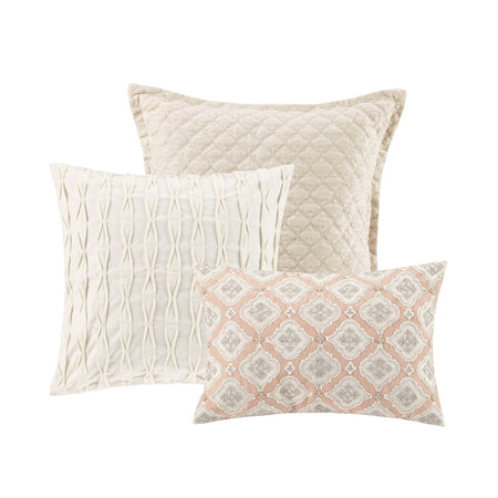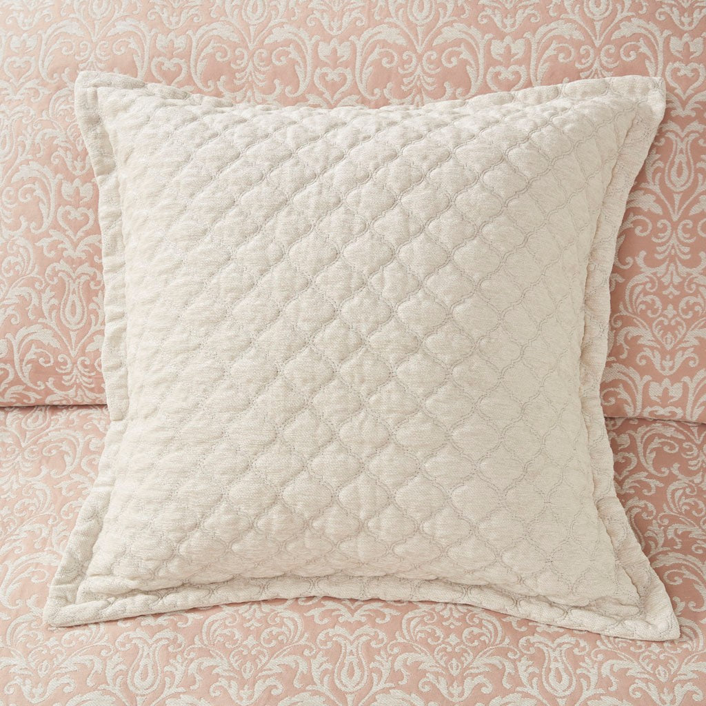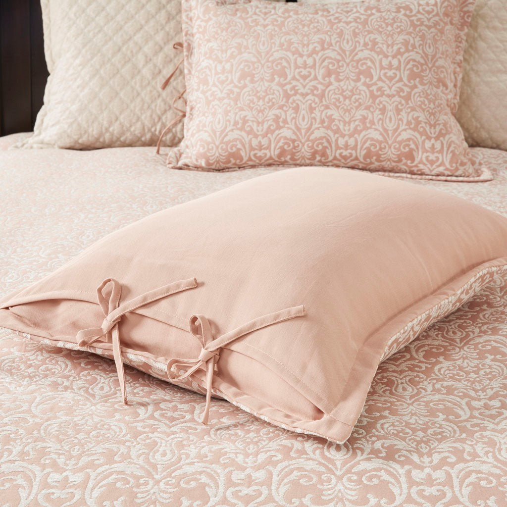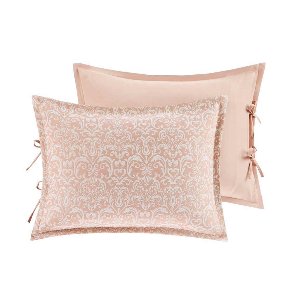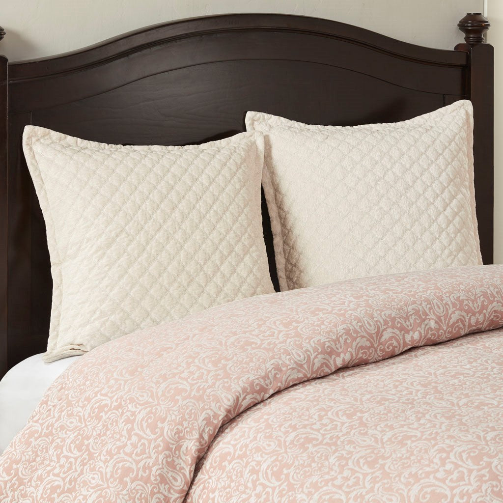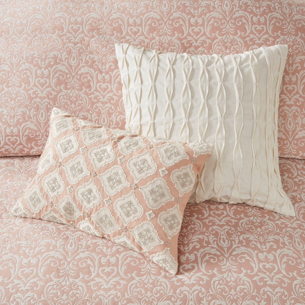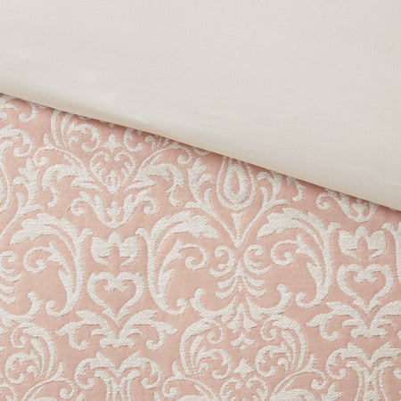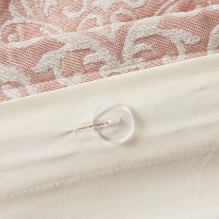 The Madison Park Signature Haven Chenille Jacquard Comforter Set introduces a subtle modern update to your bedroom. This luxurious jacquard comforter features an allover white chenille damask pattern on blush background to create a rich and elegant look. Two matching shams pair perfectly with the comforter, while two quilted Euro shams complement the contemporary design. Also included are two square and an oblong decorative pillow featuring quilted, embroidery or pleated details that add the finishing touches to this luxurious comforter set. The removable comforter filler is machine washable, but the comforter is dry clean only.