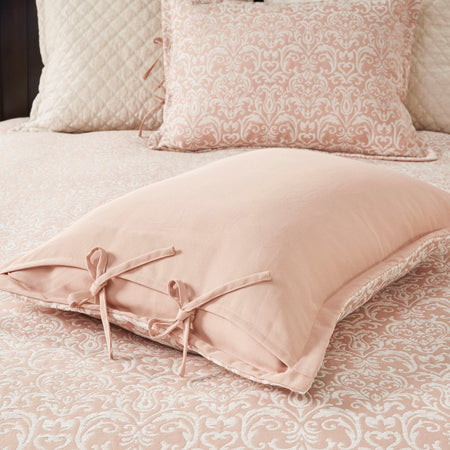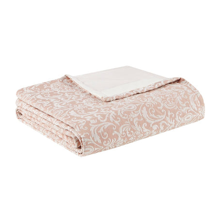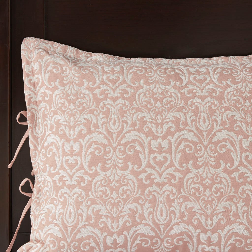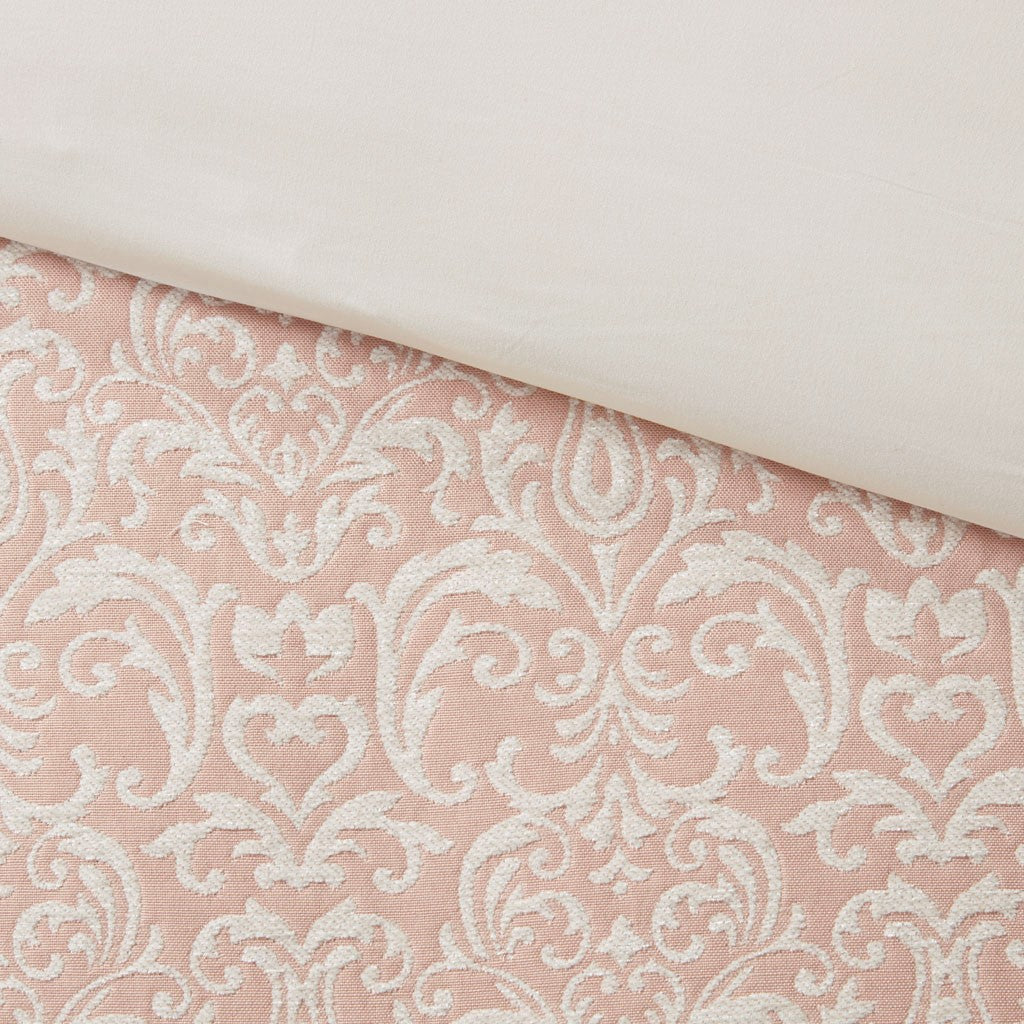 - Feature allover white chenille damask pattern on blush background