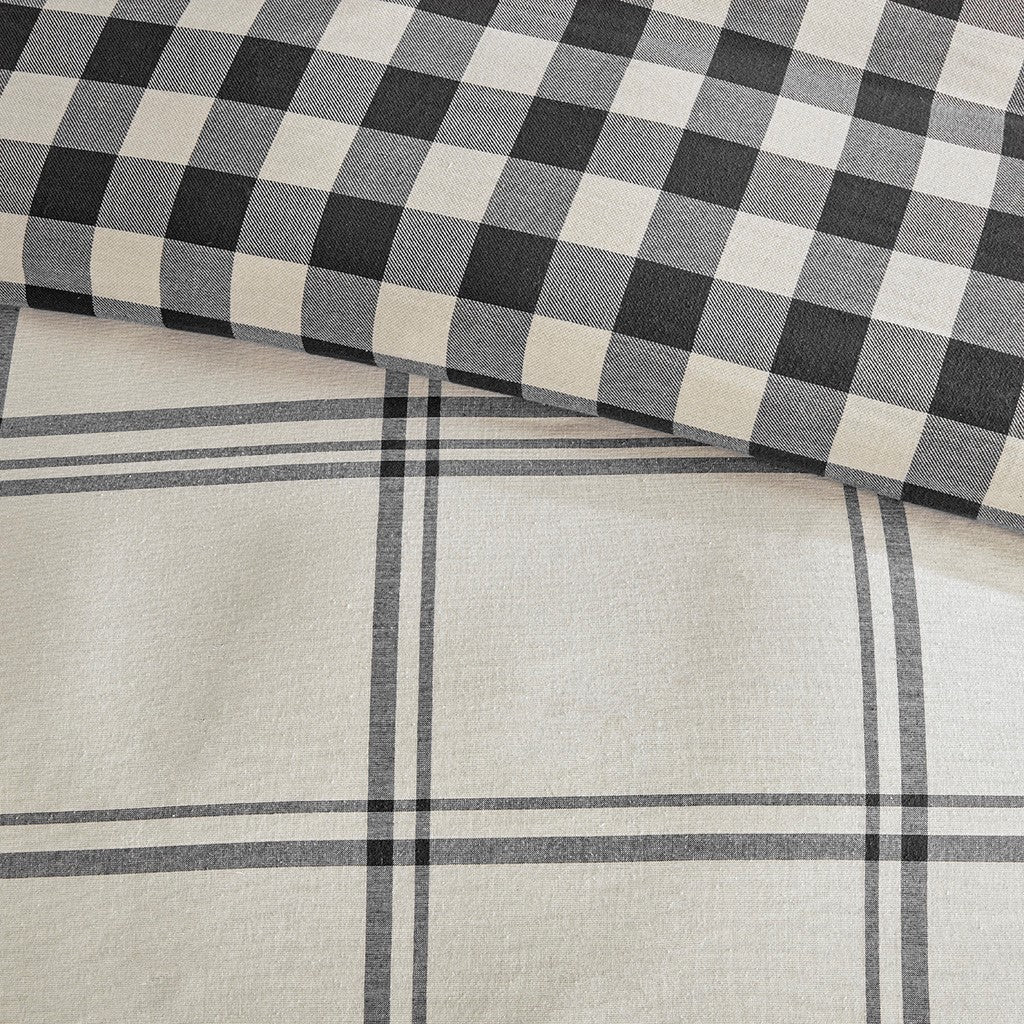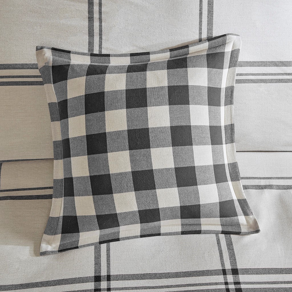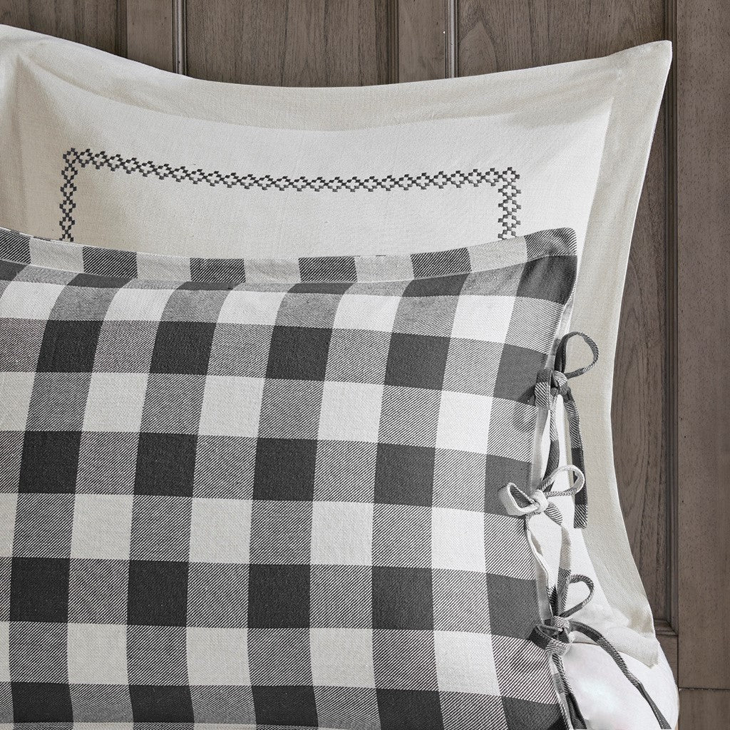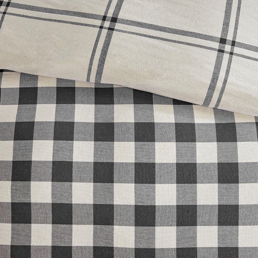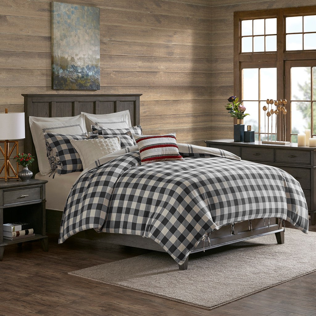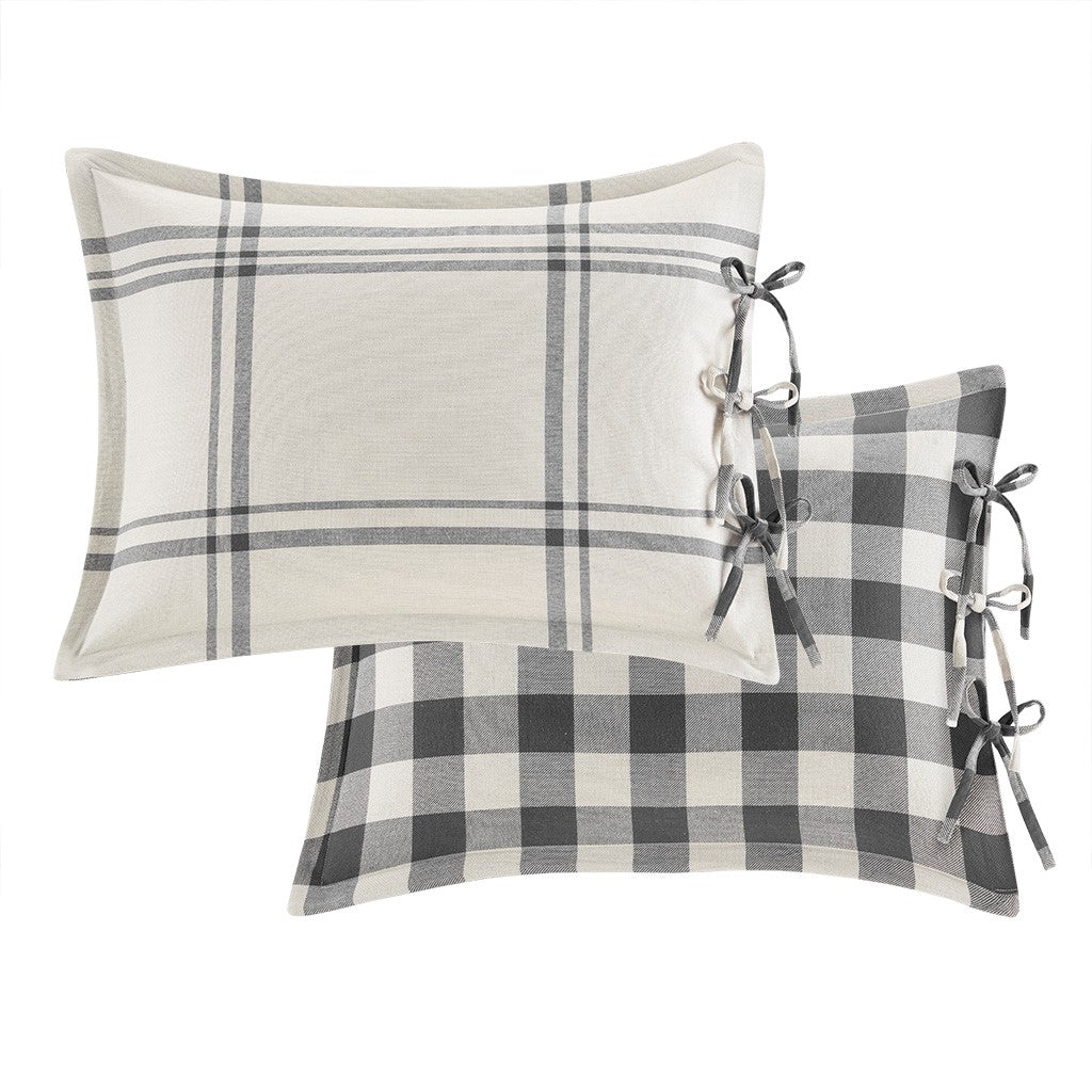 Create a handsome and cozy allure in your bedroom with the Madison Park Signature Willow Oak Reversible 8 Piece Comforter Set. The 100% cotton duvet-style comforter displays a yarn dyed grey plaid pattern that reverses to a buffalo checkered pattern, for a charming farmhouse look.