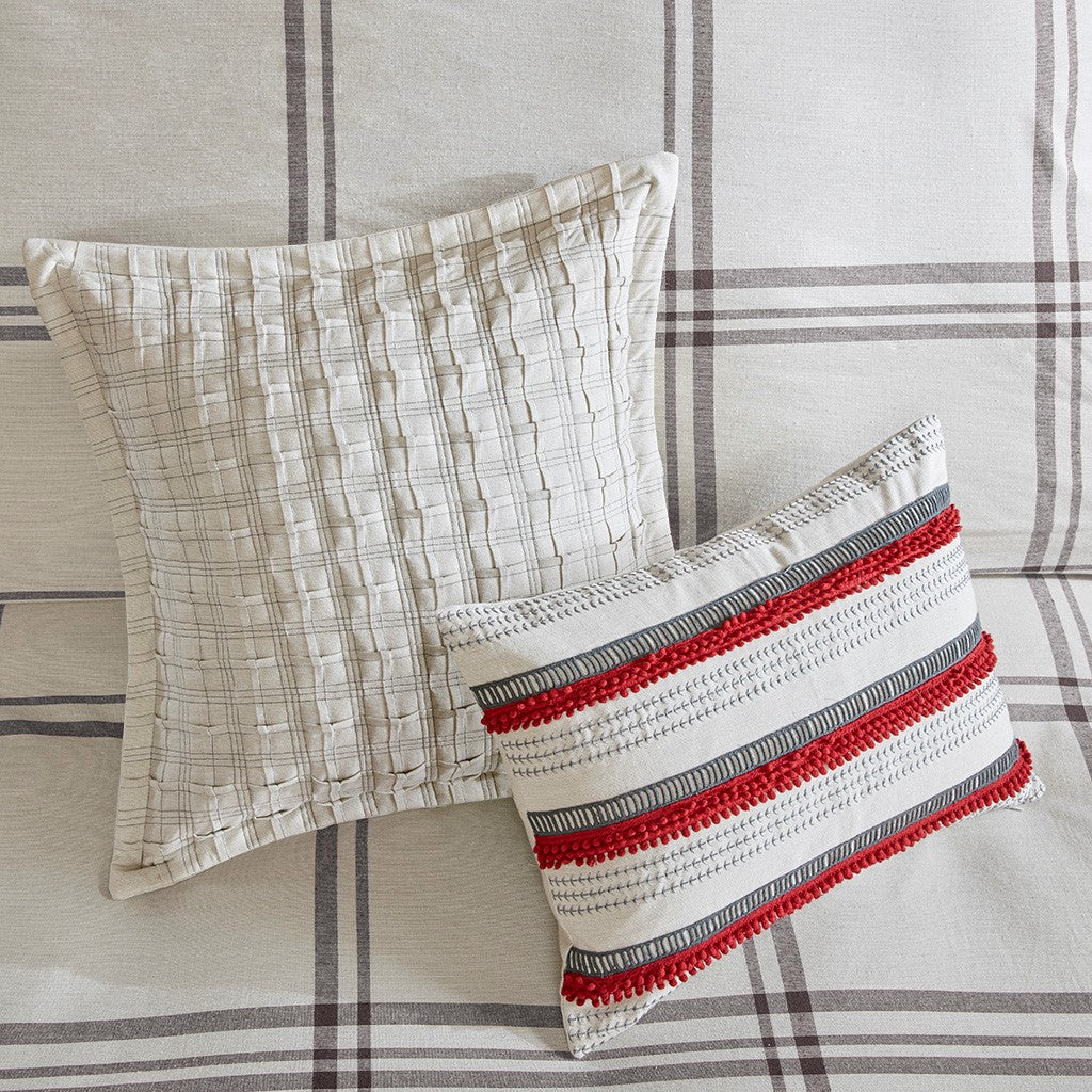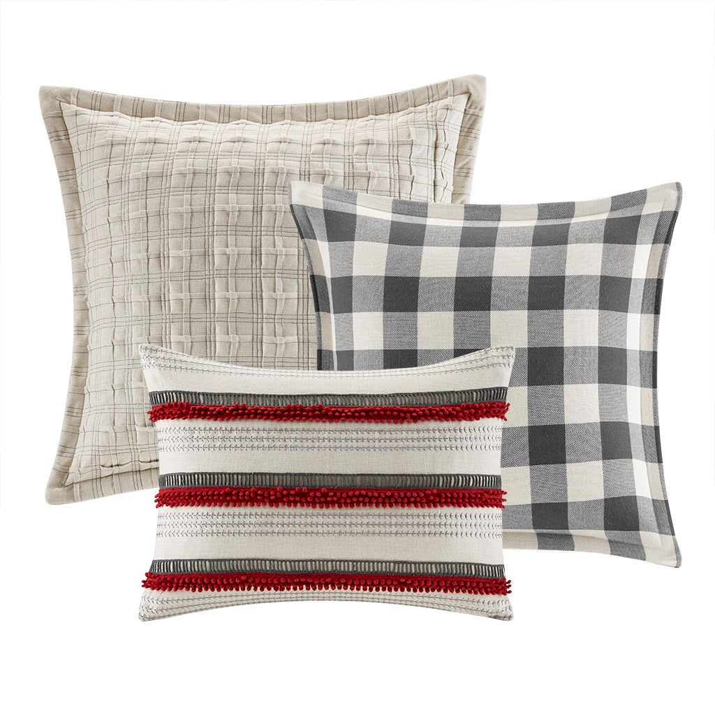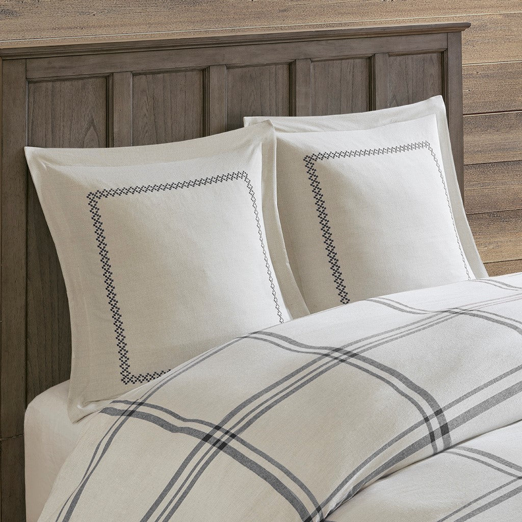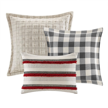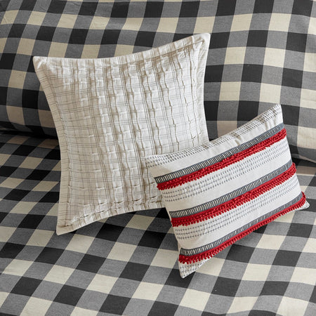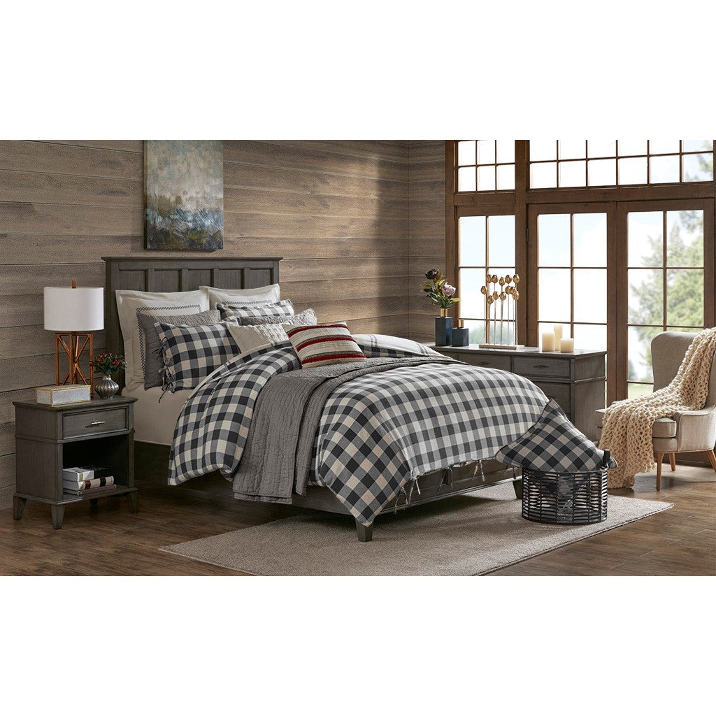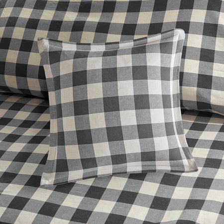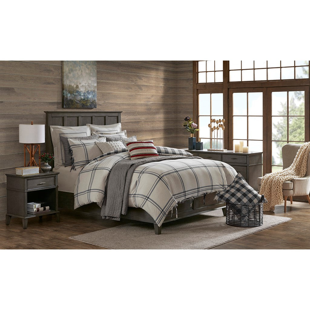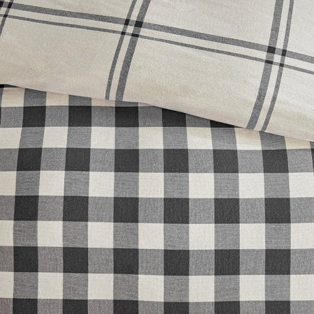 Create a handsome and cozy allure in your bedroom with the Madison Park Signature Willow Oak Reversible 8 Piece Comforter Set. The 100% cotton duvet-style comforter displays a yarn dyed grey plaid pattern that reverses to a buffalo checkered pattern, for a charming farmhouse look.