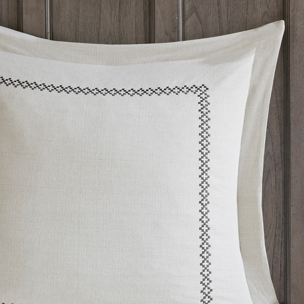 Matching shams and charming Euro shams coordinate with the design seen on top of the bed, pulling the entire ensemble together. Three decorative pillows, in complementary hues, and tie closure details on the shams and comforter add texture and dimension to complete the rustic aesthetic.