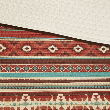 Create a warm, lodge look in your space with the Madison Park Taos 6 Piece Reversible Coverlet Set. This striped look features different geometric motifs in red, spice and pops of aqua for a colorful update to your space. Three decorative pillows feature piecing and embroidery for a cohesive look.