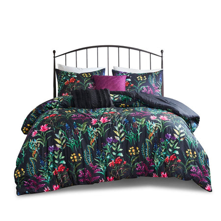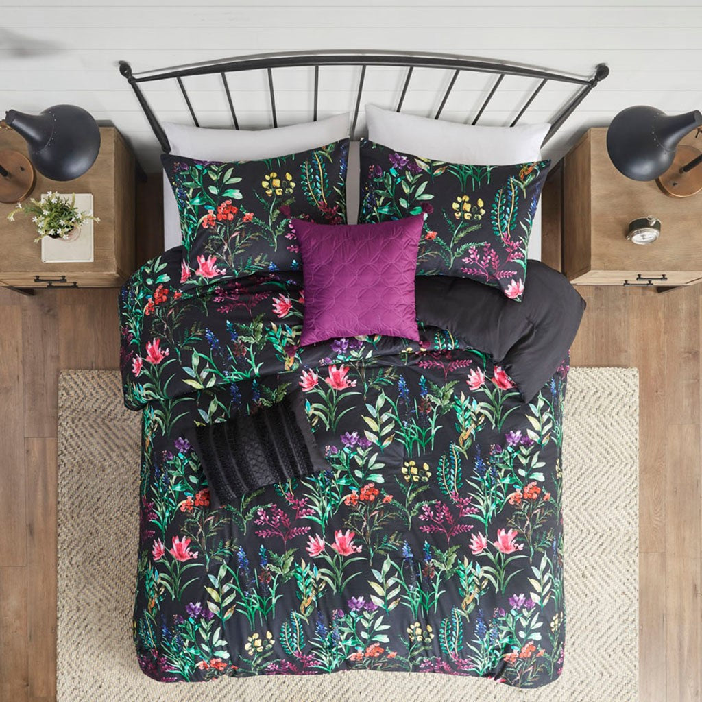 The Madison Park Tasha 5 Piece Comforter Set offers a striking floral update to your bedroom decor. This softspun comforter features a beautiful botanical print that creates a stunning contrast with the black base fabric, for a luxurious look. A solid black reverse complements the face of the comforter, adding a bold touch of color. The 2 matching shams coordinate perfectly with the comforter and the 2 decorative pillows complete the glam farmhouse look. Hypoallergenic polyester filling in the comforter and pillows provide exceptional comfort. Machine washable for easy care, this botanical comforter set has an antimicrobial odor protection treatment that provides built-in freshness protection, inhibits growth of odor causing bacteria, and keeps the fabric newer, longer. Items in the set may come in a rolled or compressed packaging, which will need to be fluffed up or steam ironed before use to remove wrinkles.