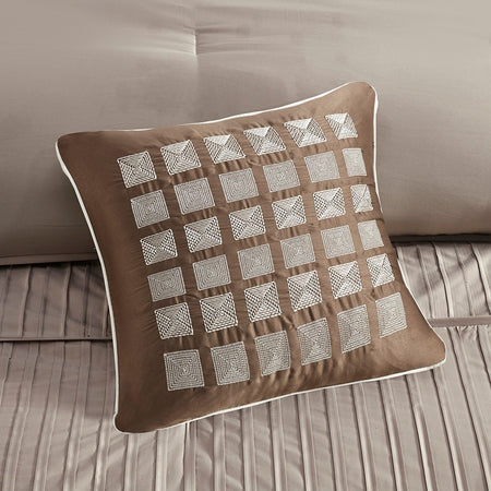 The Madison Park Trinity Collection provides a modern look through fabric manipulation. This beautiful taupe polyester charmeuse gives a slight sheen to this bed while the small pleating on the bottom half of the bed and corresponding shams provides great dimension for your room. Three decorative pillows use embroidery and pleating to bring this beautiful collection together. Items in the set may come in a rolled or compressed packaging, which will need to be fluffed up or steam ironed before use to remove wrinkles.