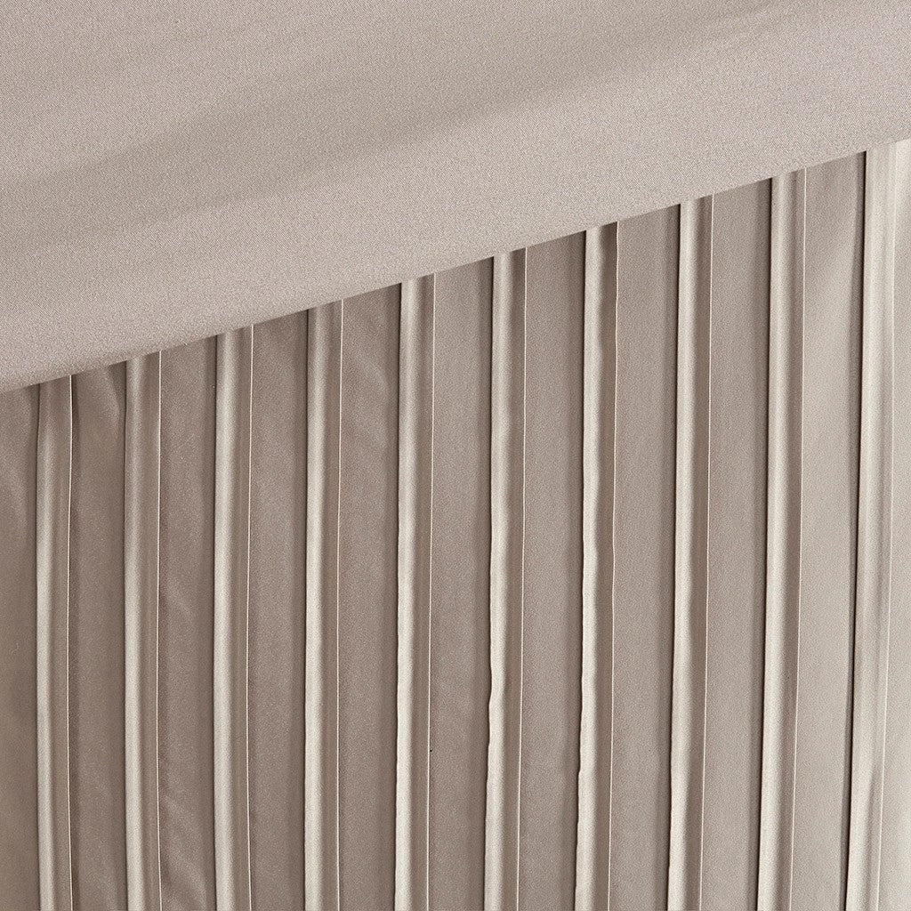 The Madison Park Trinity Collection provides a modern look through fabric manipulation. This beautiful taupe polyester charmeuse gives a slight sheen to this bed while the small pleating on the bottom half of the bed and corresponding shams provides great dimension for your room. Three decorative pillows use embroidery and pleating to bring this beautiful collection together. Items in the set may come in a rolled or compressed packaging, which will need to be fluffed up or steam ironed before use to remove wrinkles.