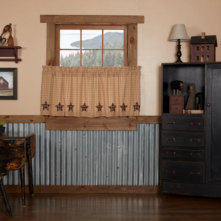 The Bingham Star Applique Tier Set of 2 brings warmth to your living area with Americana colors and a cozy design. This set of 2 tiers feature beautiful soft black, khaki, and barn red shades with a straight edge, cotton lining, and applique star design. Our L24xW36 tiers are finished with a convenient rod pocket that adds country appeal to your kitchen or living room.