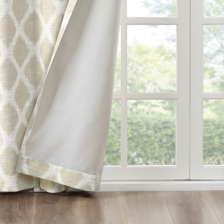 Introducing a modern and stylish take on energy efficiency, our SunSmart Blakesly Printed Ikat Blackout Panel is the perfect update to any room. Fresh and chic, this window panel features a printed taupe ikat design on a textured firm base fabric, creating dimension for a cool and casual look. Finished with a two pass foamback and bonding technique, the panel is enhanced to block most sunlight and create a significant barrier to reduce outside noise. Silver grommet top detail makes it easy to hang, open, and close panels throughout the day; while fitting up to a standard 1.25"Â diameter rod. With considerable energy savings and a high level of added privacy, this blackout panel is perfect for home offices, family rooms, and bedrooms. Give your space a beautiful, one-of-a-kind update with this contemporary blackout window panel. Lighting level: Heavily Shaded Ambiance.
