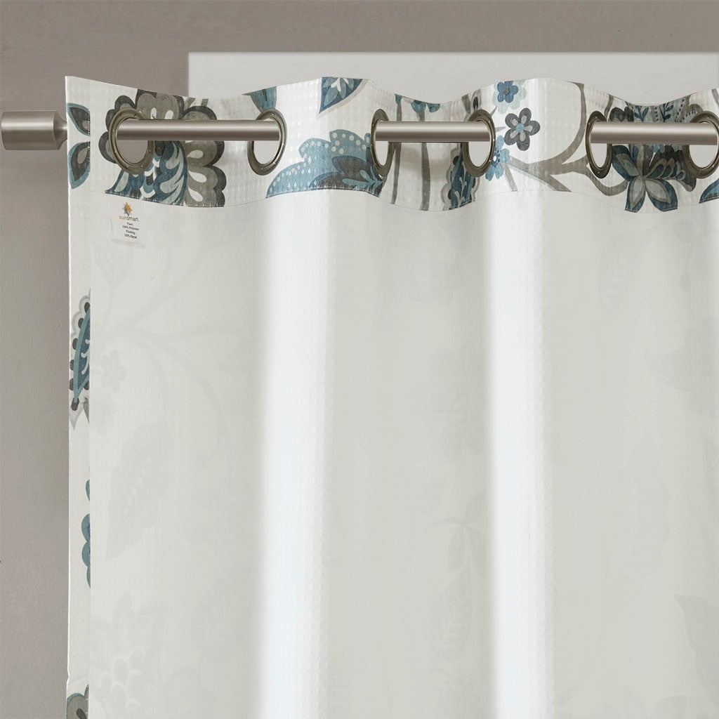 Beautifully frame your window with the stylish and functional SunSmart Camille Printed Room Darkening Curtain. A floral design in deep aqua, silver, and taupe hues is printed on a white dobby jacquard fabric creating texture and sheen for beautiful dimension and charm. Featuring a one pass foamback finish, this window panel provides a room darkening effect to soften harsh sunlight, while also serving as an effective barrier to dampen outside noise. In addition, this window panel is also OEKO-TEX certified, meaning it does not contain any harmful substances or chemicals, ensuring quality comfort and wellness. Silver grommets at the top make it easy to hang, open, and close throughout the day; fits up to a 1.25" diameter rod. Offering a moderate level of added privacy with nominal energy savings, this room darkening window panel brings a casual update to your home while creating a low ambiance lighting level, perfect for dining rooms, living rooms, or hallways.
