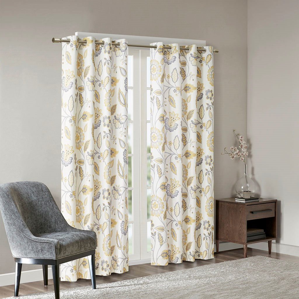 Beautifully frame your window with the stylish and functional SunSmart Camille Printed Room Darkening Curtain. A floral design in deep yellow, grey, and taupe hues is printed on a white dobby jacquard fabric creating texture and sheen for beautiful dimension and charm. Featuring a one pass foamback finish, this window panel provides a room darkening effect to soften harsh sunlight, while also serving as an effective barrier to dampen outside noise. In addition, this window panel is also OEKO-TEX certified, meaning it does not contain any harmful substances or chemicals, ensuring quality comfort and wellness. Silver grommets at the top make it easy to hang, open, and close throughout the day; fits up to a 1.25" diameter rod. Offering a moderate level of added privacy with nominal energy savings, this room darkening window panel brings a casual update to your home while creating a low ambiance lighting level, perfect for dining rooms, living rooms, or hallways.