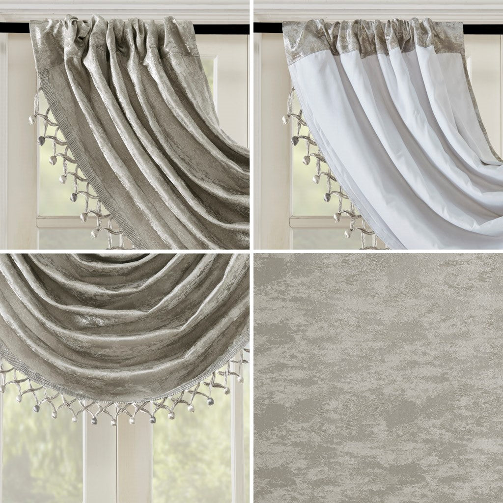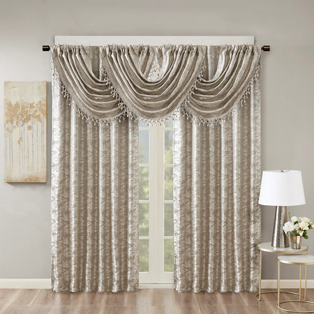 Our SunSmart Cassius Jacquard Valance accents your windows with stunning beauty and functional style. This elegant window valance flaunts a marble jacquard design in a rich gold hue creating a luxurious sheen, for a lavish look. An embellished trim lines the edge of the valance, while the scoop and draping center detailing creates a stunning addition to your window decor. This Valance is also OEKO-TEX certified, meaning they do not contain any harmful substances or chemicals, for quality comfort and wellness. With its exquisite style, this window valance is perfect on its own to dress up smaller windows, or combine with coordinating panels sold separately for the complete look. Finished with a rod pocket top; Fits up to a 1.25" diameter rod.