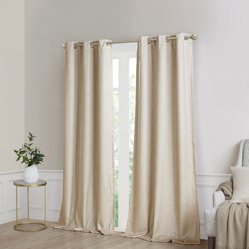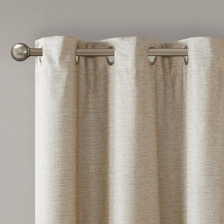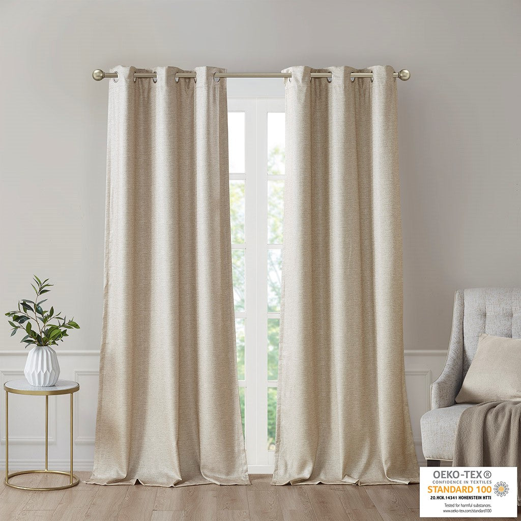 Elevate your decor with the modern style and function of our SunSmart Como Tonal Printed Faux Silk Total Blackout Panel Pair. This blackout curtain pair flaunts a tonal taupe hue on a faux silk textured fabric that creates a beautiful and rich modern look. Also achieving the OEKO-TEX certification, these curtains do not contain any harmful substances or chemicals ensuring quality comfort and wellness. Each panel features a heavyweight light grey foamback on the reverse making it 100% total blackout, blocking out all outside light, noise, and intrusion for the highest level of privacy. Using thermal technology, the total blackout curtain also helps provide maximum energy savings by keeping your room the perfect temperature throughout the year. Easily hang, open, and close panels throughout the day with the silver grommet top finish; this total blackout window panel pair is perfect for use in bedrooms, media rooms, or any private space providing a pitch black ambiance lighting level when curtains are fully closed.
