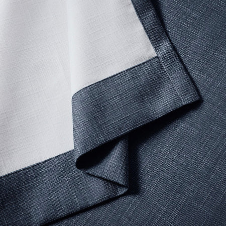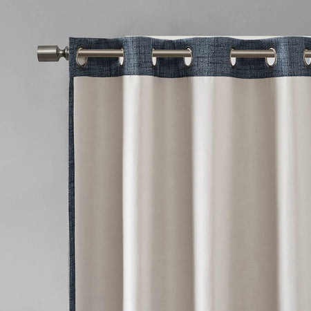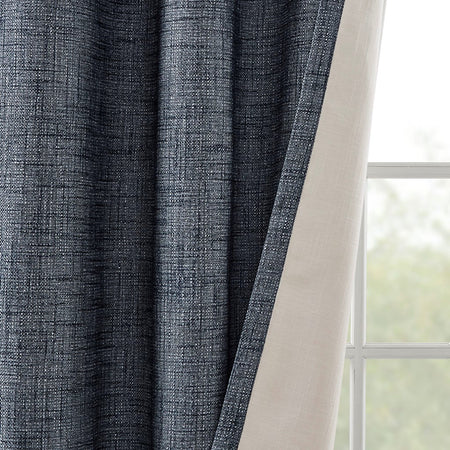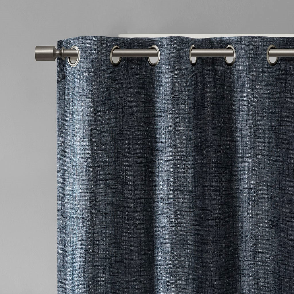 Energy efficiency meets chic casual style, with the SunSmart Maya Printed Heathered Blackout Panel. Featuring a printed heathered design in navy hue, this blackout window panel is made from a textured polyester slub base fabric creating beautiful texture and dimension. A one pass foamback finish with additional bonding is added and enhances the panel to buffer most sunlight, while also creating a significant barrier to reduce outside noise. The silver grommet top makes it easy to hang, open, and close the window panel throughout the day; fits up to a 1.25"Â diameter rod. Perfect for home offices, family rooms, and bedrooms - this blackout panel provides considerable energy savings and a high-level of privacy by bringing a heavily shaded lighting level to any room.